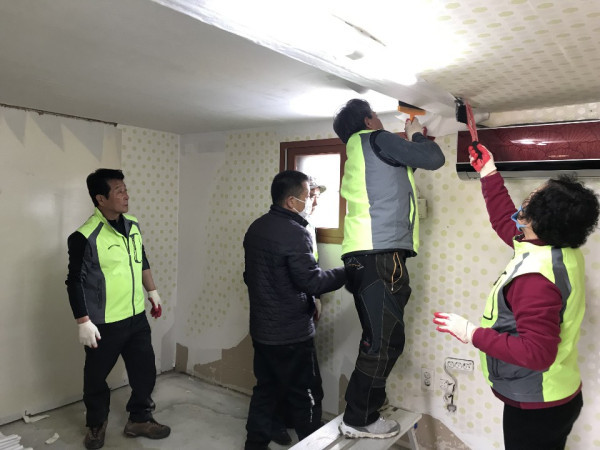 경기 포천시 영중면 주민자치위원회는 7일 면 무한돌봄센터와 연계해 지역내 주거환경이 열악한 저소득 취약계층의 집에 오래된 벽지와 장판을 교체하는 ‘사랑의 집수리 봉사활동’을 실시했다. 사진은 봉사자들이 벽지를 교체하는 모습. (사진제공=포천시청)