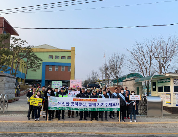 충남 아산시는 7일 남성초등학교 정문에서 3월 안전점검의 날을 맞아 모범운전자회, 녹색어머니연합회, 지역자율방재단, 안전보안관, 시청직원 등 40여명이 안전한 등하굣길 교통지도 캠페인을 실시했다. 사진은 캠페인 진행 모습. (사진제공=아산시청)