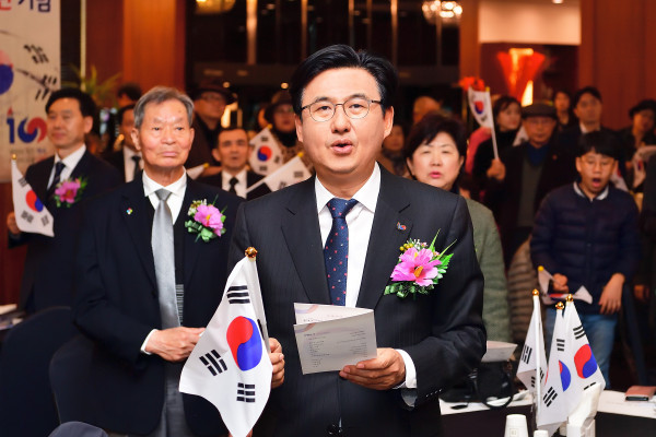 송파구가 7일 지역내 독립유공자와 후손 등 150명을 초대해 3.1절 100주년 기념행사를 개최했다. 이번 행사에서는 독립유공자 라용균의 자녀 라종일씨와 정찬조의 자녀인 정인만씨가 선친의 독립운동 활동내역을 발표했다. 사진은 행사에 참가한 박성수 구청장(가운데)가 태극기를 들고 있는 모습. (사진제공=송파구청)