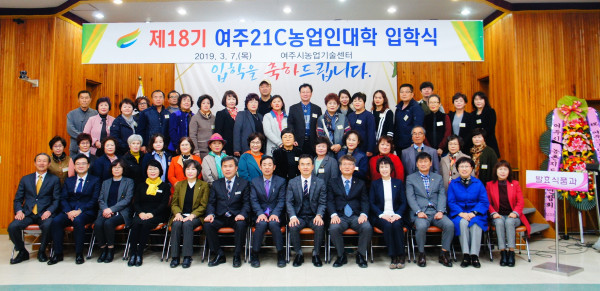 경기 여주시는 7일 농업기술센터 대강당에서 ‘제18기 여주21C농업인대학 입학식’을 개최했다. 이날 입학식은 입학생과 내빈 등 130여명이 참여한 가운데 진행됐다. 사진은 이항진 시장(앞줄 오른쪽에서 여섯번째)과 입학생들의 기념촬영 모습. (사진제공=여주시청)
