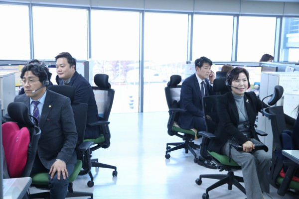 경기 화성시의회 기획행정위원회가 8일 오전 화성시 콜센터를 방문, 직접 콜센터 업무를 체험해보고, 상담사들의 애로사항을 파악하는 시간을 보냈다. 사진은 직접 콜센터 상담을 하고 있는 기획행정위원들의 모습. (사진제공=화성시의회)