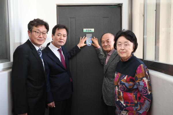 서울 강북구는 최근 3.1운동 및 대한민국임시정부 수립 100주년을 맞아 노백린 애국지사의 유족 노영탁씨의 자택을 방문해 독립유공자의 집 명패를 달았다. 사진은 박겸수 구청장(왼쪽에서 두번째)이 명패를 달고 유족들과 기념촬영 하는 모습. (사진제공=강북구청)