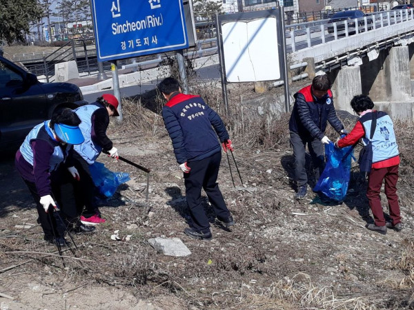 최근 경기 양주시 한국자유총연맹 은현분회가 새봄을 맞아 쾌적하고 아름다운 은현면을 만들기 위해 한국자유총연맹 깃발 교체와 함께 환경정화 운동을 실시했다. 사진은 신천 다리 부근을 청소하고 있는 은현분회원들의 모습. (사진제공=양주시청)