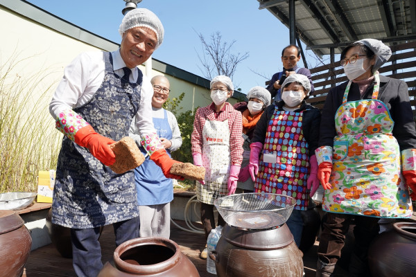 서울 성북구가 지난 8일 안암동 주민센터에서 전통식품의 우수성을 알리고 바른 먹거리에 대한 인식을 확산하기 위해 ‘이웃과 함께하는 성북장독대’ 행사를 개최했다. 사진은 이번 행사의 장담그기에 참여한 이승로 구청장(왼쪽)과 주민들의 모습. (사진제공=성북구청)