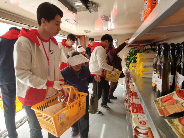 최근 서울 구로구가 BC카드의 후원으로 구청 앞마당에서 ‘이동푸드마켓 식품나눔 행사’를 개최했다. 사진은 BC카드 서포터스가 식품나눔 행사 참가 노인들을 돕고 있는 모습. (사진제공=구로구청)