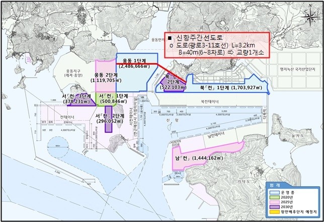 신항 전체 준공 시 항만도로, 공원・녹지 등 항만기반시설 유지관리에 연간 200억원이 소요될 것으로 예상된다.