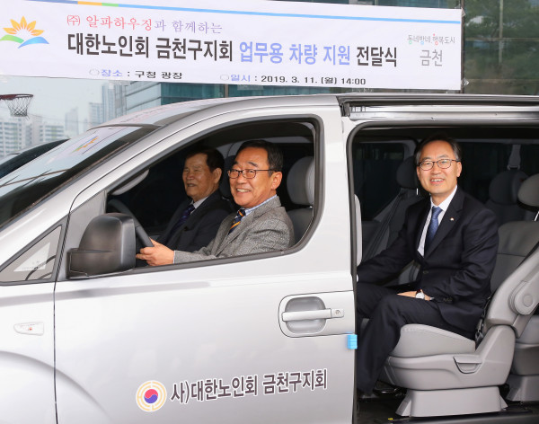 서울 금천구는 11일 오후 2시 구청 광장에서 대한노인회 금천구지회에 업무용 차량(스타렉스)을 전달하는 증정식을 열었다. 이번 증정식은 비주거용 건물 개발 및 공급업체인 (주)알파하우징의 사회공헌활동의 일환으로 진행됐다. 사진은 유성훈 구청장 및 관계자들이 차량을 시승해보고 있는 모습. (사진제공=금천구청)
