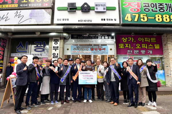 경기 안산시는 11일 안산사랑상품권 ‘다온’ 1호 가맹점 현판식을 개최했다. 이날 현판식에는 윤화섭 시장, 지역상인 등 총 50여명이 참석했다. 사진은 윤 시장과 가맹점주 및 관계자들이 가맹점 가입을 축하하는 모습. (사진제공=안산시청)