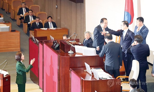 12일 오전 국회 본회의장에서 열린 자유한국당 나경원 원내대표 교섭단체 대표연설에서 더불어민주당 홍영표 원내대표 등이 국회의장을 찾아 나 대표의 발언에 항의하고 있다.