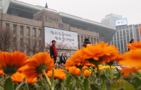봄꽃 심기 작업이 한창인 12일 오전 서울도서관 외벽 '꿈새김판'에 봄을 맞아 따뜻한 위로를 전하는 새 문안이 적혀 있다. 봄편 공모전 당선작인 "이름 없는 날도 봄이 되더라 이름 없는 꽃도 향기롭더라"는 하종윤 씨와 홍종찬 씨가 각각 제출한 것을 하나로 합친 문안이다.