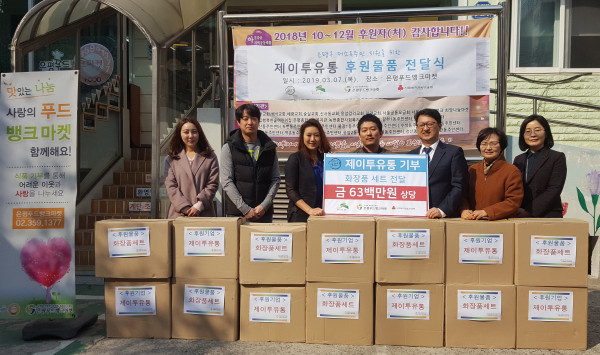 서울 은평구 은평푸드뱅크마켓은 최근 (주)제이투유통으로부터 ‘화장품 세트’ 700세트(6300만원 상당)를 전달 받았다. 이날 전달 받은 화장품은 지역내 어려운 이웃들에게 기부될 예정이다. 사진은 이날 전달식에서 관계자들의 기념촬영 모습. (사진제공=은평구청)