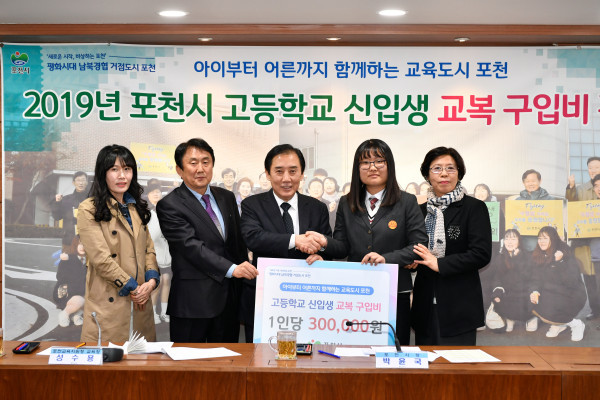 경기 포천시가 지난 11일 지역내 고등학교 7곳 교장·학부모·학생 등 30여명이 참석한 가운데 ‘2019년 고등학교 신입생 교복 구입비 전달식’을 개최했다. 사진은 박윤국 시장(가운데)이 학생에게 교복 구입비를 전달하며 기념촬영하는 모습. (사진제공=포천시청)