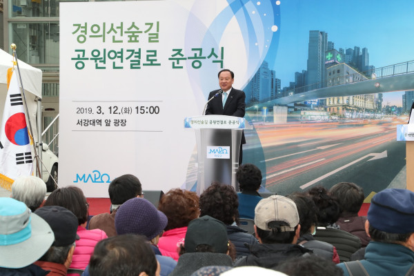 유동균 마포구청장은 12일 경의중앙선 서강대역 광장에서 열린 ‘경의선숲길 공원연결로 준공 및 제막식’에 참석했다. 이날 국회의원과 시·구의원, 지역주민 등 300여명이 참석했다. 사진은 유 구청장이 인사말을 전하는 모습. (사진제공=마포구청)