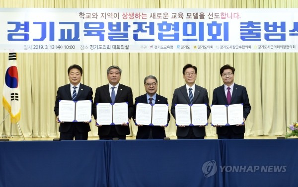 경기도교육청과 경기도, 도의회, 시장·군수협의회, 시·군의회 의장협의회 등 5개 기관이 함께 교육 현안을 논의하고 협력하는 '경기교육발전협의회'가 13일 출범했다. 사진 왼쪽부터 박문석 경기도시군의회의장협의회장, 송한준 경기도의회 의장, 이재정 경기도교육감, 이재명 경기도지사, 염태영 경기도시장군수협의회장.