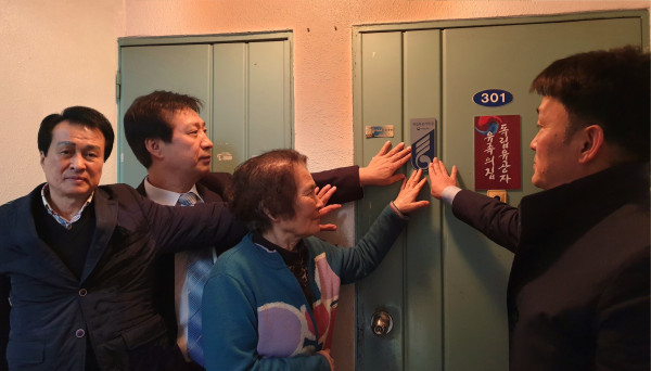 서울 은평구 불광2동은 지난 12일 3.1 운동 100주년을 맞아 지역내 독립유공자 안해용의 손녀 안향자씨(75)의 집을 방문해 독립유공자 명패 부착식을 진행했다. 사진은 동 관계자들이 독립유공자 유족의 대문에 명패를 부착하는 모습. (사진제공=은평구청)