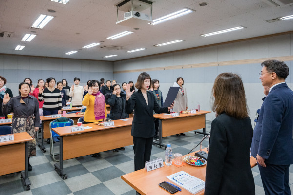 광진구는 13일 구청 종합상황실에서 ‘청소년 자원봉사교육 강사단’ 발대식을 개최했다. 발대식은 김선갑 구청장을 비롯해 최창홍 청소년 자원봉사교육 강사단장 및 단원 총 30명이 참석한 가운데 진행됐다. 사진은 강사단 활동 선서를 하고 있는 강사단원들의 모습. (사진제공=광진구청)