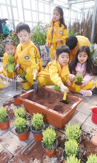 14일 경기도 파주시 산림조합 임산물유통센터에서 열린 2019 나무시장 개장식에서 지역 어린이들이 한반도 평화를 기원하며 나무 심기를 체험하고 있다.