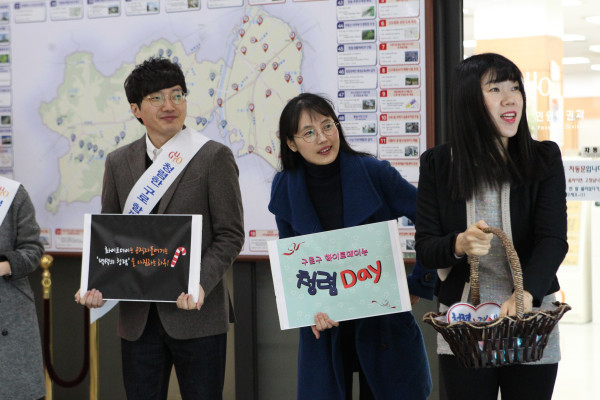 서울 구로구가 14일 구청 현관에서 ‘청렴사탕 나누기’ 캠페인을 실시했다. 화이트데이 순백의 이미지를 착안해 기획된 이날 행사는 출근길 직원들에게 500여개의 박하사탕과 청렴문구를 적은 종이사탕을 전달했다. 사진은 직원들에게 사탕을 나눠주는 관계자들의 모습. (사진제공=구로구청)