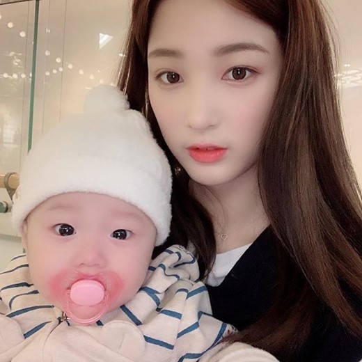 율희는 인스타그램에 "째율이랑 외출"이라고 적고 사진을 게재했다. 아기를 품에 안고 찍은 셀카. 하얀색 털모자를 뒤집어쓴 율희의 아들이 귀여운 표정을 짓고 있다.