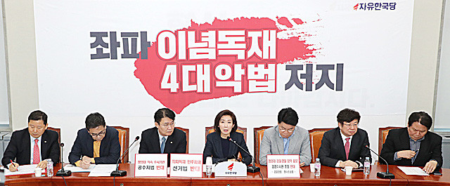 자유한국당 나경원 원내대표(가운데)가 17일 오후 국회에서 열린 선거법·고위공직자비리수사처(공수처)법 날치기 저지 긴급대책회의에서 발언하고 있다. /연합뉴스