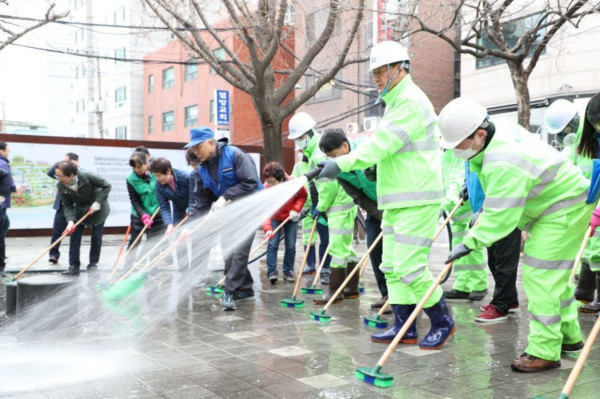 서울 마포구는 최근 양화진 성지 역사문화공원에서 정자, 자전거 거치대, KT 안심부스 등의 도로 및 공용 시설물에 대한 대대적인 물청소를 실시했다. 사진은 유동균 구청장(오른쪽 두번째)과 주민 및 관련 부서 직원들이 물청소를 하는 모습. (사진제공=마포구청)