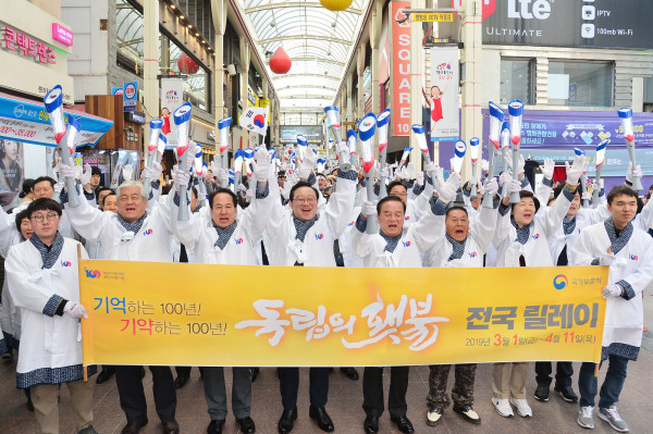 황세영 울산시의장은 지난 울산보훈지청 주관으로 지난 16일 울산시 중구 성남동 젊음의 거리 일원에서 열린 '독립의 횃불 전국 릴레이' 울산지역 행사에 참석했다. 사진은 황 의장(왼쪽 세 번째), 송철호 울산시장(왼쪽 네 번째) 등이 만세를 외치고 있는 모습. (사진제공=울산시의회)