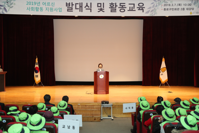 이날 발대식에는 2019년 어르신 사회활동 지원사업에 참여하는 어르신 430여 명이 참석하였고, 참여자 대표 2명이 선서문을 낭독해 지역사회 봉사자로서 결의를 다졌으며, 참여자의 자긍심을 높혔다.
