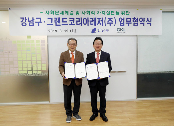 정순균 서울 강남구청장이 19일 구청 3층 제1작은회의실에서 ‘강남구-그랜드코리아레저 사회가치실현 공동협력사업 업무협약식’을 열고 사회적 경제 활성화, 사업의 발굴·추진을 위해 협력사업비를 지원하는 등 상호협력할 것을 약정했다. 사진은 협약 후 기념촬영을 하고 있는 정 구청장(왼쪽)과 유태열 그랜드코리아레저 대표의 모습. (사진제공=강남구청)