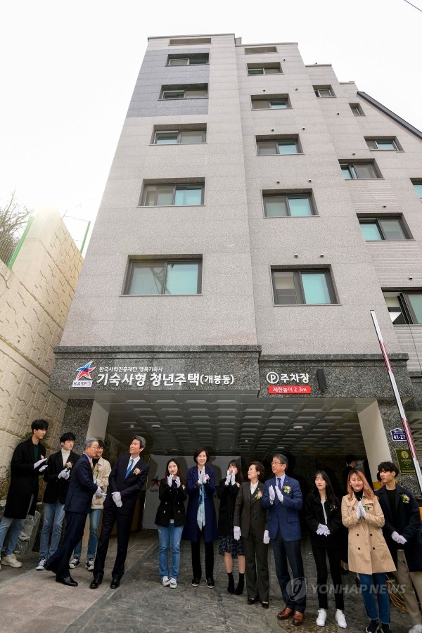 18일 개봉동 '기숙사형 청년주택' 개관식에서 유은혜 부총리 겸 교육부 장관을 비롯한 참석자들이 기념촬영을 하고 있다. 대학생을 위한 첫 '기숙사형 청년주택'으로 기숙사비는 1인당 월평균 23만원 수준이다. 보증금은 20만원이다.