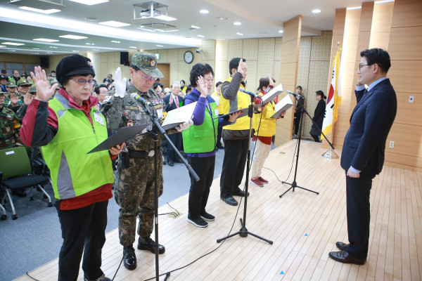 | ▲ 구청 5층 대강당에서 진행된 '2019년 노인일자리 및 사회활동 지원사업 및 통합발대식'에서 사업 참가자들이 이정훈 구청장(오른쪽)에게 선서를 하고 있다. (사진제공=강동구청) | ||
