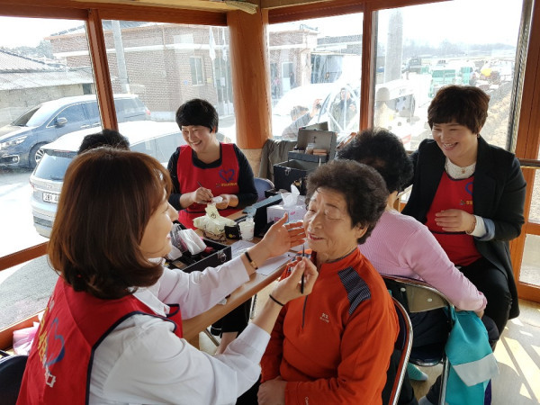 전남 영암군을 대표하는 봉사단으로 자리매김한 드림봉사단이 19일 군서면 검주리마을에서 올해 첫 봉사활동의 시작을 알렸다. 사진은 이날 봉사단원들이 노인들에게 메이크업을 해주고 있는 모습. (사진제공=영암군청)