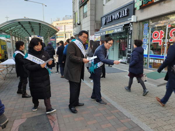 | ▲ 방민수 의원(가운데)이 구민을 대상으로 '암사 초록길 서명운동'을 하고 있다. (사진제공=강동구청) | ||