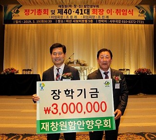 또한 향우회에서는 축하화환 대신 받은 백미 17포(10㎏) 및 고향의 인재육성을 위해 (재)함안군장학재단에 장학기금 300만 원을 전달했으며, 2011년부터 7년간 꾸준히 장학기금을 전달해 현재까지 총 2400만원을 기탁했다.