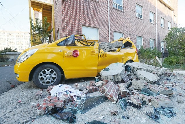 2017년 11월 발생한 포항지진은 인근 지역의 지열발전으로 촉발됐다고 포항지진 정부조사연구단이 20일 밝혔다. 사진은 2017년 11월 15일 규모 5.4 지진으로 파손된 포항시 북구의 한 어린이집 차량 모습.