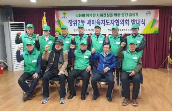 최근 서울 성북구 장위2동 주민센터 3층 대강당에서 동 새마을지도자협의회 발대식이 개최됐다. 협의회는 자발적으로 참여를 표시한 11명의 회원으로 구성됐으며, 이들은 이날 활발한 봉사활동을 할 것을 다짐했다. 사진은 기념촬영을 하는 모습. (사진제공=성북구청)