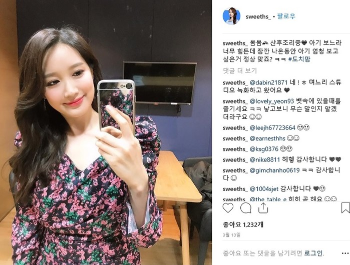 이현승의 인스타그램에는 "봄봄🌈 산후조리중💙 아기 보느라 너무 힘든데 잠깐 나온동안 아기 엄청 보고싶은거 정상 맞죠? ㅋㅋ #도치맘"이라는 글과 함께 사진이 게재됐다.
