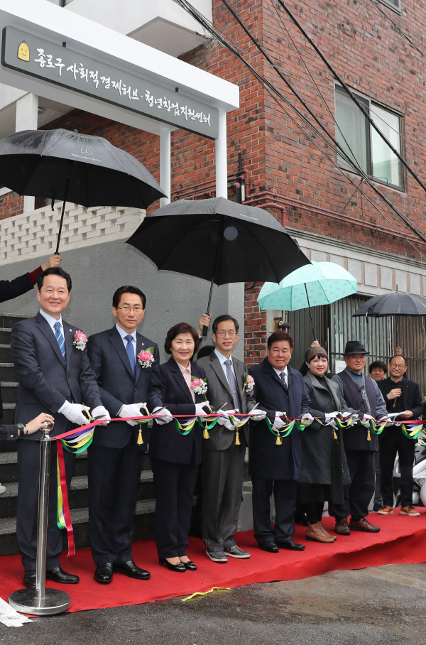 지난 20일 서울 종로구의회가 구 사회적경제허브·청년창업지원센터 개관식에 참석했다. 사진은 개관식 후 기념촬영을 하고 있는 유양순 의장(왼쪽 세번째)과 구의원들의 모습. (사진제공=종로구의회)