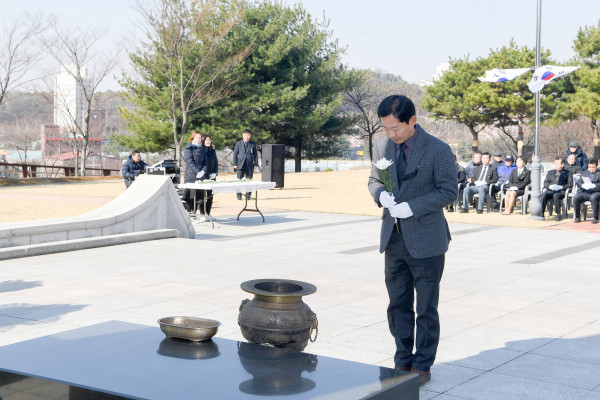 경기 오산시는 22일 시 현충탑에서 시 보훈단체협의회 주관으로 '제4회 서해수호의 날' 기념식을 거행했다. 이날 행사에는 김문환 부시장과 장인수 시의회 의장, 시의원, 보훈단체장, 보훈가족, 시민 등 200여명이 참석했다. 사진은 김 부시장이 헌화하고 있는 모습. (사진제공=오산시청)