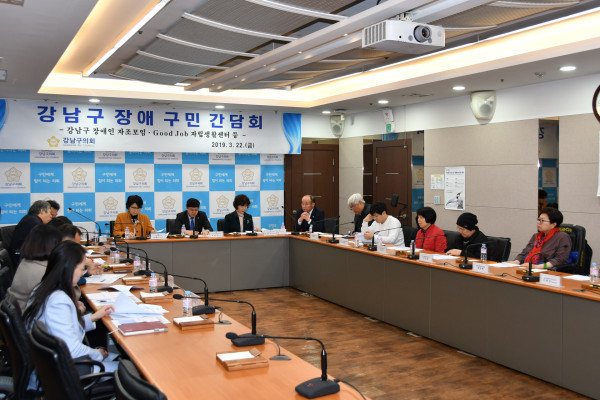 [시민일보=이대우 기자] 서울 강남구의회(의장 이관수)가 최근 구의회 열린회의실에서 ‘강남구 장애 구민 간담회’를 열고 장애인 복리증진을 위한 정책에 대해 의견을 나눴다.