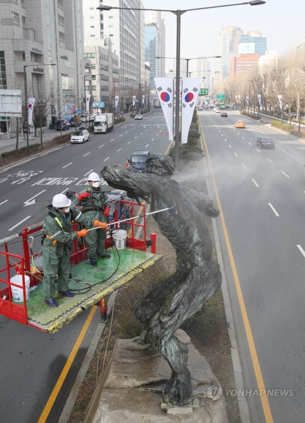 26일 오전 송파구 올림픽공원 앞 도로에서 송파구청 관계자들이 고압 세척기를 이용해 서울올림픽 기념 조형물을 세척하고 있다.