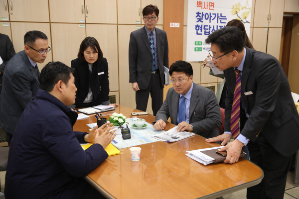 엄태준 경기 이천시장은 25일 현안사항에 대해 보고받고 주민들과 현장 소통을 했다. 이날 현안에 대한 해결방안을 모색하고, 주민여가시설 등을 방문해 주민들의 의견을 청취했다. 사진은 엄태준 시장(오른쪽에서 두번째)이 보고받는 모습. (사진제공=이천시청)