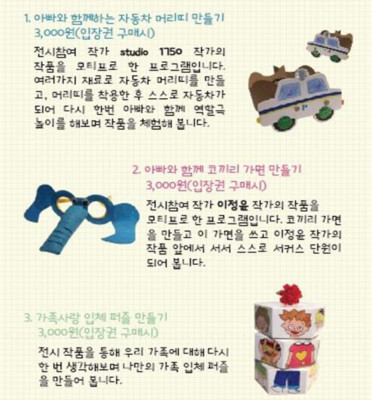 아빠와 아이가 함께 할 수 있는 자동차 머리띠만들기(3,000원), 코끼리가면만들기(3,000원)와 가족사랑 입체 퍼즐 만들기(3,000원)를 통해 가족이 함께 하는 시간이 될 것이다. 또한 가족이 방문할 때 아빠 동반 시 아빠는 무료로 입장이 가능하다.