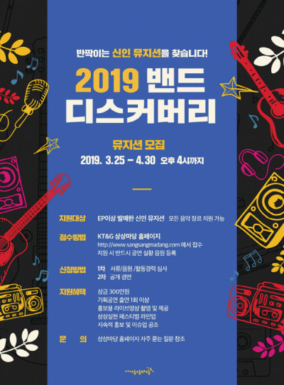 ‘밴드 디스커버리’는 장르에 상관없이 EP(Extended Playing) 이상의 음반을 1장 이상 발매한 뮤지션이면 누구나 지원할 수 있다. 참가 희망자는 KT&G 상상마당 홈페이지를 통해 접수 가능하며, 1차 전문가 평가와 2차 공개 경연 심사를 거쳐 2팀이 최종 선발된다.