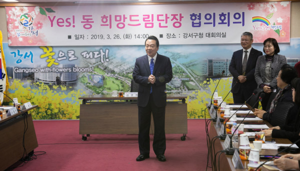 서울 강서구는 26일 구청 대회의실에서 동 희망드림단장 20명이 참석한 가운데 복지사각지대 발굴을 위한 ‘동 희망드림단 협의회의’를 개최했다. 이날 참여자들은 희망드림단의 활동사례를 공유하고 운영 방향에 대해 논의했다. 사진은 노현송 구청장이 인사말을 전하는 모습. (사진제공=강서구청)