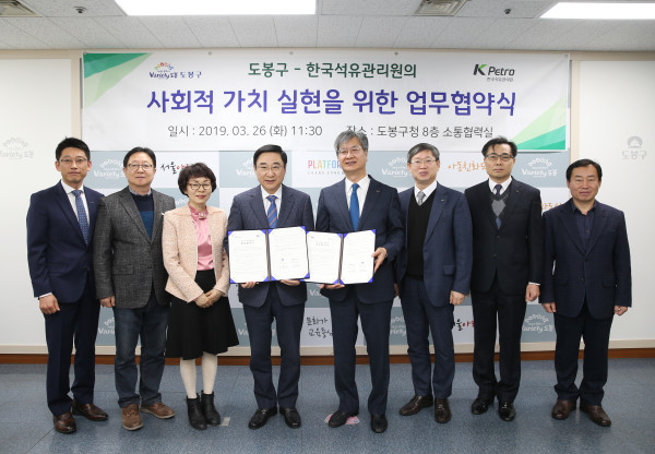 도봉구는 26일 구청 소통협력실에서 한국석유관리원과 ‘사회가치 공동실현을 위한 협약식’을 개최해 가짜 석유 유통근절을 위한 합동단속실시 등을 약속했다. 사진은 이동진 구청장(왼쪽에서 네번째)과 관계자들이 기념촬영을 하는 모습. (사진제공=도봉구청)