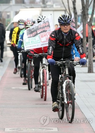 27일 오전 서울 송파구청 앞에서 녹색자전거봉사단연합 회원과 시민들이 '미세먼지 저감 나부터 시민실천활동 자전거 홍보 캠페인'을 하고 있다.