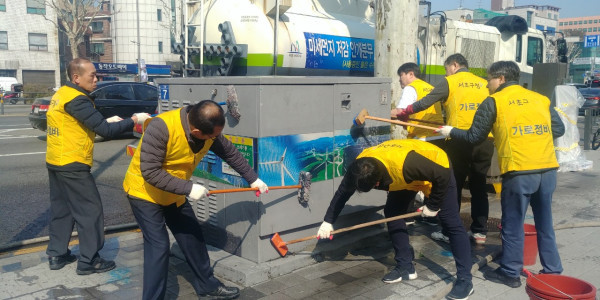 지난 26일 서초구가 동작대로에 설치된 가로판매대, 구두수선대, 부스형 판매대, 분점함 등 가로시설물 32개의 환경정비를 실시했다. 사진은 청소 참가자들이 비누칠을 하며 시설물의 묵은때를 벗기고 있는 모습. (사진제공=서초구청)
