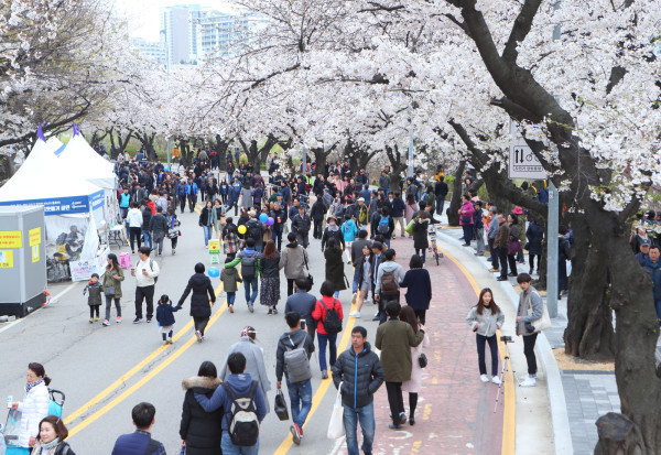 여의서로 1.7km 구간에 평균수령 60년 안팎의 탐스러운 왕벚나무 1886주와 진달래, 개나리, 철쭉 등 13종·8만7000여주의 봄꽃이 만개해 장관을 이룬다.