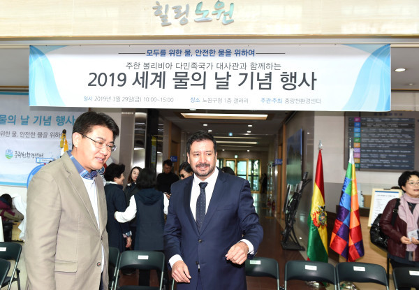 오승록 서울 노원구청장은 지난 29일 구청 1층 갤러리에서 열린 ‘세계 물의 날 기념행사’에 참석했다. 이날 행사에는 주한 볼리비아 대사관이 참석해 축사를 했다. 사진은 오 구청장(왼쪽)이 주한 볼리비아 대사관을 맞이하는 모습. (사진제공=노원구청)