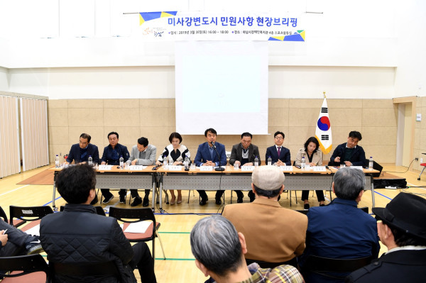 경기 하남시는 지난 30일 하남시장애인복지관에서 민·관 협치로 미사의 당면 현안 문제를 함께 해결하기 위해 현장브리핑을 실시했다. 이날 브리핑에는 미사강변도시내(미사1·2동, 풍산동 미사강변도시 일부) 통장, 주민자치위원 등 6개 관변단체와 공동주택 대표, 노인회 임원, 지역주민 등 300여명이 참석했다. 사진은 김상호 시장(가운데)이 발언하는 모습. (사진제공=하남시청)